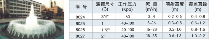 | 此喷头喷水时水流自扁平的喷嘴喷洒形成扇形水膜,一般以组合造型为主。该喷泉喷头组合图形优美,变化多端。组图能力很强,常用于酒店别墅等场所,也很适合安装在一般的小水池中,灯光效果好,水声音小因而广泛安装和使用。 产品效果图及参数表: